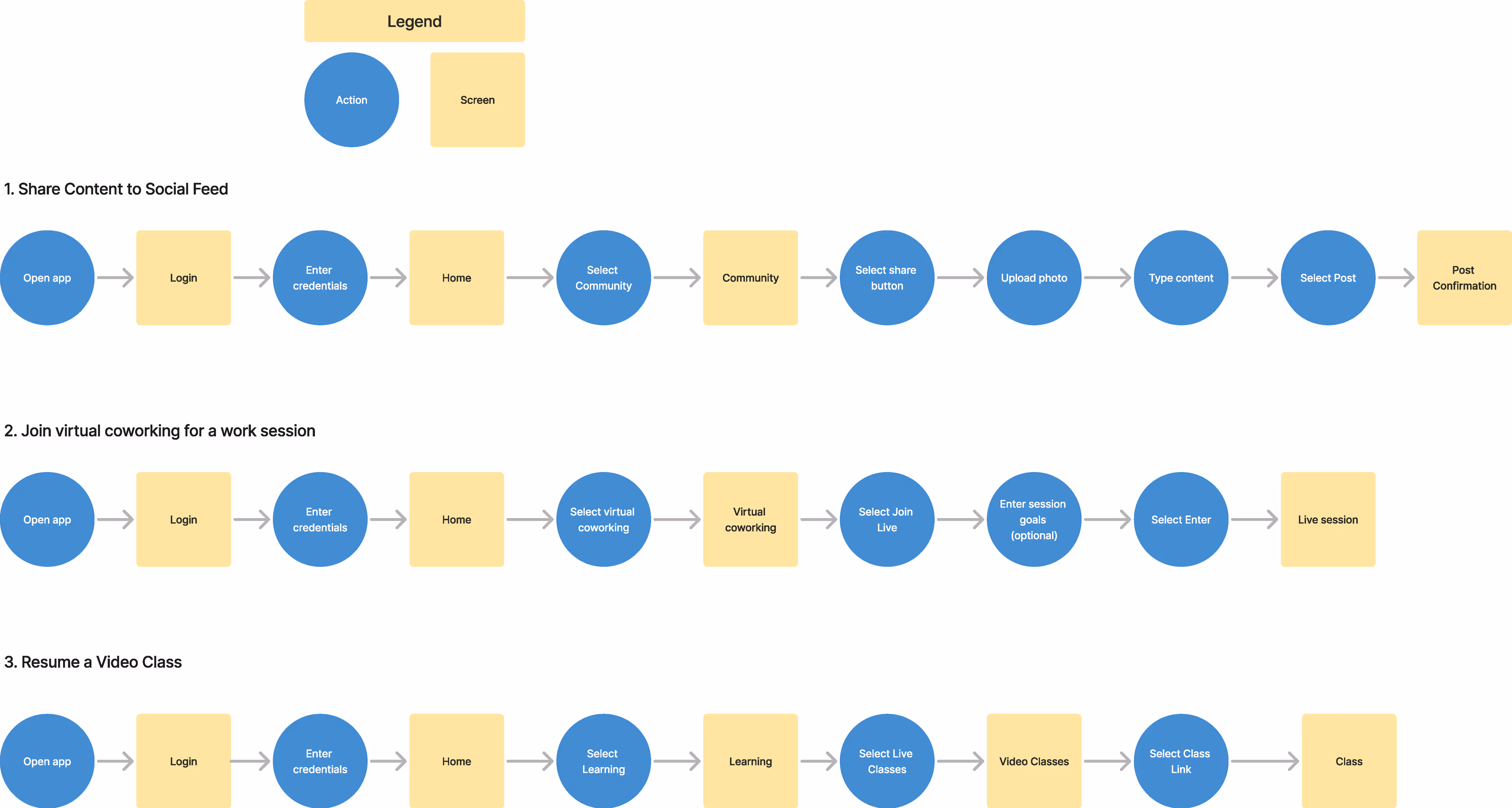 As part of defining the user experience for Steam Sisters, I mapped out three primary actions that reflect the app's core values: connection, support, and growth. These flows showcase how users might naturally engage with the platform in ways that align with their personal and professional goals.